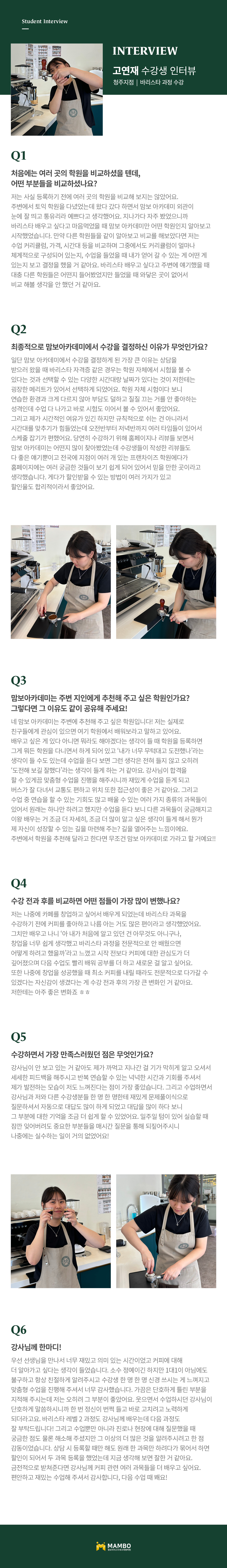 제1조 (개인정보 수집에 대한 동의)맘보교육그룹(이하 회사)는 이용자들이 회사의 개인정보취급방침 또는 이용약관의 내용에 대하여 “동의”버튼 또는 “취소”버튼을 클릭할 수 있는 절차를 마련하여, “동의”버튼을 클릭하면 개인정보 수집에 대해 동의한 것으로 봅니다. 제2조 (개인정보 수집항목) 온라인 문의를 통한 상담을 위해 처리하는 개인정보 항목은 아래와 같습니다. 수집항목 : 성명, 이메일, 전화번호 제3조 (개인정보의 이용목적) 회사는 이용자의 사전 동의 없이는 이용자의 개인 정보를 공개하지 않으며, 원활한 고객상담, 각종 서비스의 제공을 위해 아래와 같이 개인정보를 수집하고 있습니다. 모든 정보는 상기 목적에 필요한 용도 이외로는 사용되지 않으며 수집 정보의 범위나 사용 목적, 용도가 변경될 시에는 반드시 사전 동의를 구할 것입니다. - 성명 : 제품상담에 따른 본인 확인 - 이메일, 전화번호 : 제품상담 및 이벤트 관련 고지사항 전달, 새로운 서비스 및 신상품 정보 제공(DM, SMS, 이메일 등 이용) 이용자는 개인정보의 수집/이용에 대한 동의를 거부할 수 있습니다. 다만, 동의를 거부하는 경우 온라인 문의를 통한 상담은 불가하며 서비스 이용 및 혜택 제공에 제한을 받을 수 있습니다. 제4조 (개인정보의 보유 및 이용기간) 원칙적으로 개인정보 수집 및 이용목적이 달성된 후에는 해당 정보를 지체 없이 파기합니다. 그리고 상법, 전자상거래 등에서의 소비자보호에 관한 법률 등 관계법렵의 규정에 의하여 보존할 필요가 있는 경우 회사는 관계법령에서 정한 일정한 기간 동안 정보를 보관합니다. 이 경우 회사는 보관하는 정보를 그 보관의 목적으로만 이용하며 보존기간은 아래와 같습니다. - 계약 또는 청약철회 등에 관한 기록 : 5년(전자상거래등에서의 소비자보호에 관한 법률) - 소비자의 불만 또는 분쟁처리에 관한 기록 : 3년(전자상거래등에서의 소비자 보호에 관한 법률) - 시용정보의 수집/처리 및 이용 등에 관한 기록 : 3년(신용정보의 이용 및 보호에 관한 법률) - 회사는 귀중한 이용자의 개인정보를 안전하게 처리하며, 유출의 방지를 위하여 다음과 같은 방법을 통하여 개인정보를 파기합니다. - 종이에 출력된 개인정보는 분쇄기로 분쇄하거나 소각을 통하여 파기합니다. - 전자적 파일 형태로 저장된 개인정보는 기록을 재생할 수 없는 기술적 방법을 사용하여 삭제합니다.