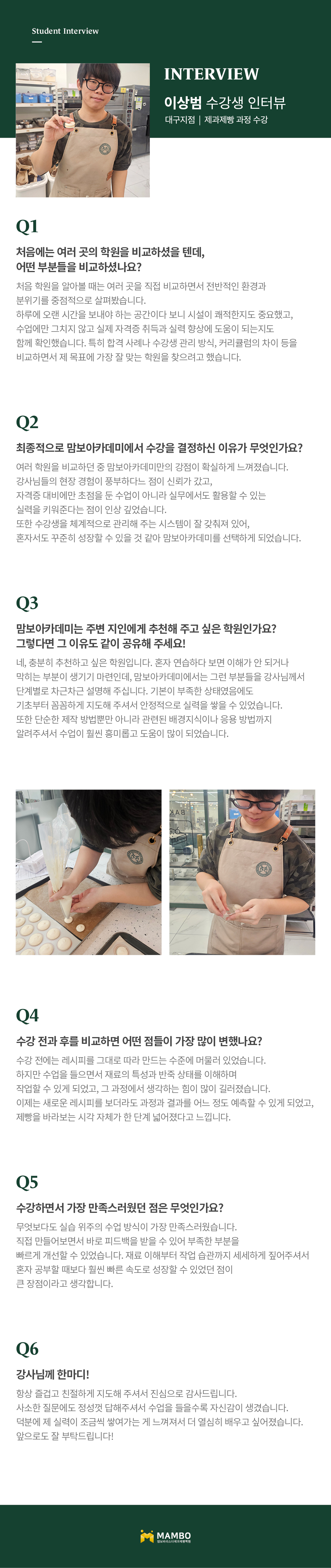 교육의 기반을 달리하여 학생의 기회를 잡아주며 직원의 기강이 태만하지 않은 맘보바리스타제과제빵학원